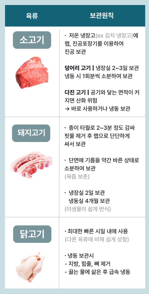 따라서 고기나 생선은 반드시 두 겹 이상의 랩 포장 또는 진공 포장을 하며, 냉동 전 전용 지퍼백이나 냉동 전용 용기에 담아 보관해야 한다. 포장 전 최대한 납작하게 펼쳐 공기 접촉면을 최소화하는 것도 핵심이다.