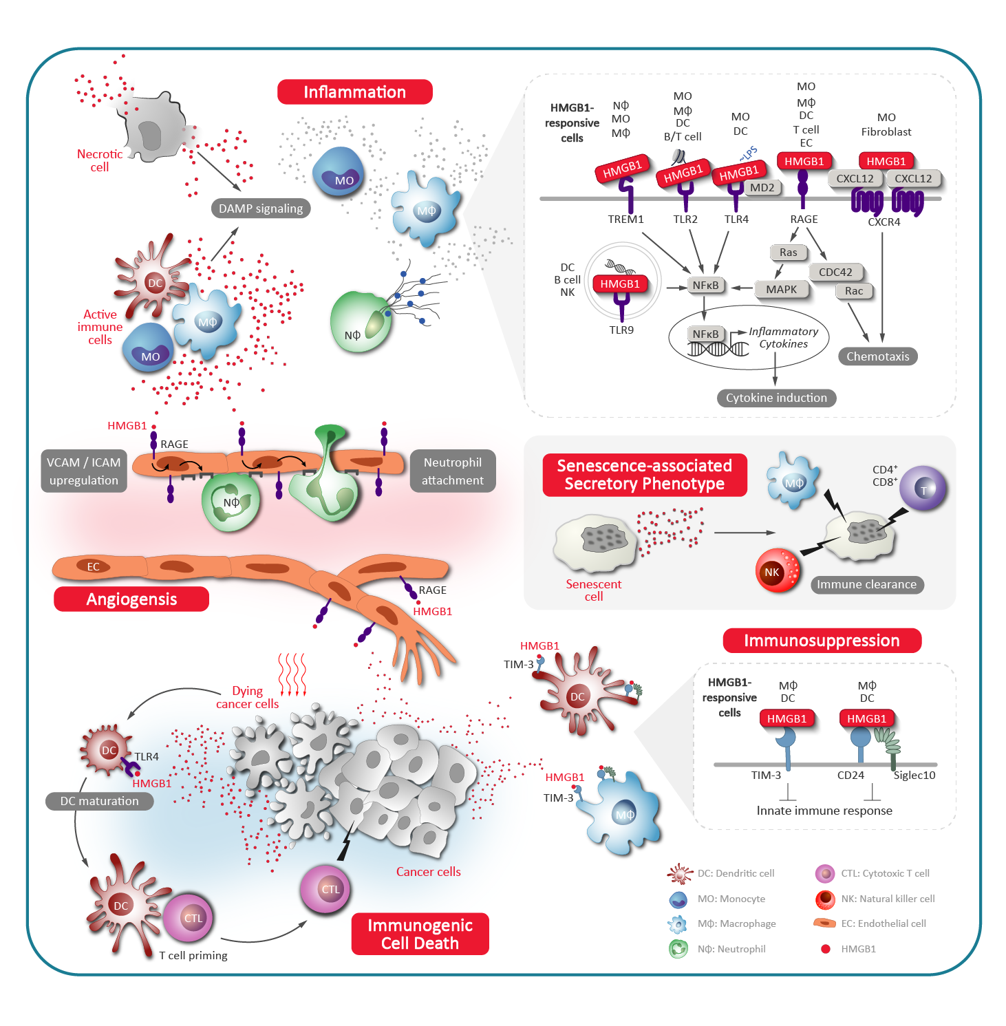 세포가 스트레스나 손상을 받을 경우, 핵 속의 HMGB1이 세포 밖으로 방출된다. 이 단백질은 면역세포의 수용체(TLR4, RAGE 등)에 결합하여 염증 반응을 유도하고, 주변 세포의 DNA 손상과 산화 스트레스를 증가시켜 노화 유전자의 발현을 촉진한다. 특히 혈류에 실린 HMGB1은 다양한 장기에 도달하여 심장, 간, 신장, 뇌 등에서도 노화 반응을 활성화시킨다. 이는 **일종의 '노화 신호 전달 시스템'**이 존재함을 뜻한다.