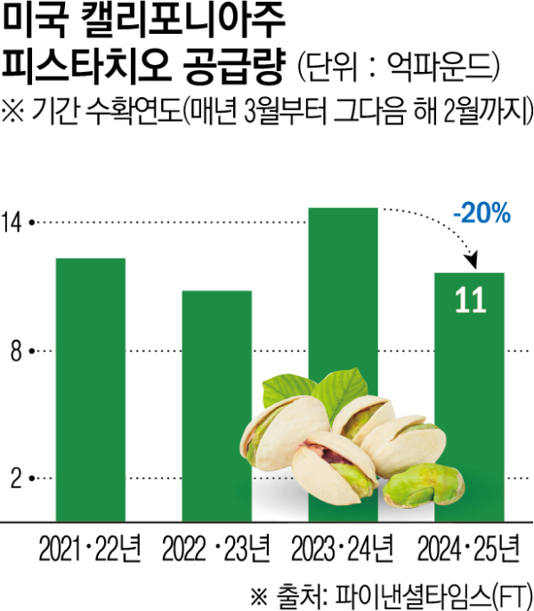 예컨대 미국 캘리포니아는 세계 최대의 피스타치오 생산지지만, 지속된 가뭄과 지하수 고갈로 인해 수확량이 줄고 있다. 이란과 터키 역시 한때 세계 최대의 피스타치오 수출국이었지만, 최근 경제 제재, 환율 변동, 기후 이상 등 복합적인 요인으로 생산량이 급감했다.