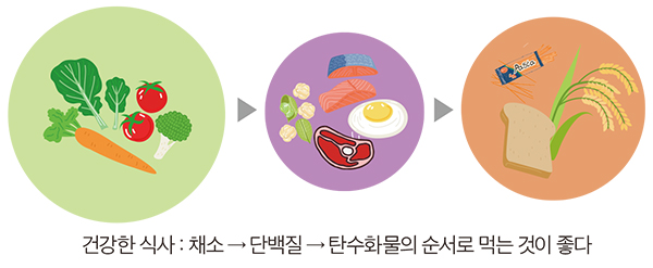 식사 시에는 채소 → 단백질 → 탄수화물 순으로 먹으면 혈당 상승을 완화할 수 있다.