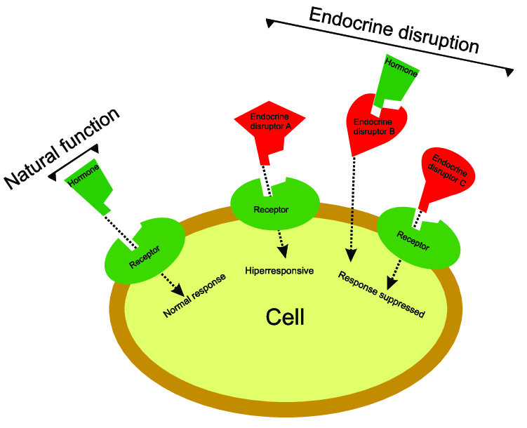 호르몬 수용체와 결합하거나 차단: 에스트로겐, 안드로겐, 갑상선 호르몬 기능에 간섭