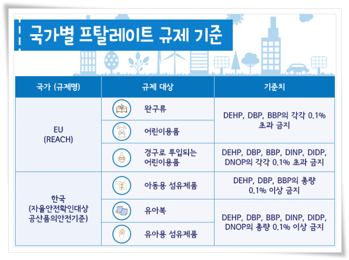 DEHP, DBP, BBP 등 일부 프탈레이트는 화장품·장난감·의료기기에서 사용 금지