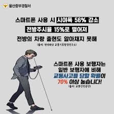 변 상황을 인지하지 못해 교통사고나 충돌 사고가 발생할 수 있다. 특히 횡단보도에서 스마트폰을 보며 걷는 사람은 신호를 무시하거나 자동차 접근을 알아채지 못하는 경우가 많아 치명적인 사고로 이어질 수 있다.