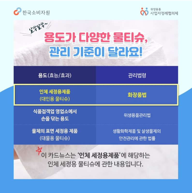 화장품으로 분류되는 물티슈는 '인체에 직접 사용하는 것을 목적으로 제조된 제품'이다. 즉, 피부를 닦거나 메이크업을 제거하거나, 혹은 아기 피부를 닦는 등의 용도로 만들어진 제품들이다. 이런 물티슈는 「화장품법」에 따라 제조되며, 사용되는 모든 성분이 공개되어야 하고, 식품의약품안전처(식약처)의 기준에 따라 안전성 검토를 거친다.