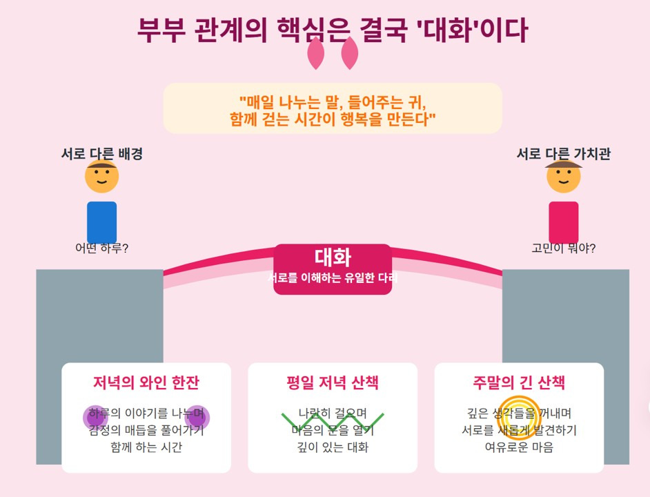 부부관계가 건강하게 지속되기 위해서는 '우리'라는 공동체 감각과 '나'라는 개별 정체성이 균형을 이루어야 한다. 지나친 개별성은 이기주의로 흐르기 쉽고, 지나친 공동체성은 자아 소외를 초래할 수 있다. 따라서 성숙한 관계란 서로의 경계를 인정하면서도, 공동의 목적을 위해 협력할 수 있는 관계다.
