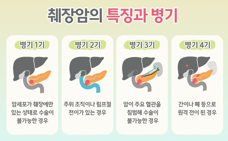췌장암은 진단 시 4기인 경우가 50% 이상이며, 실제 환자의 평균 생존 기간은 진단 후 6개월 이내인 경우도 많습니다.