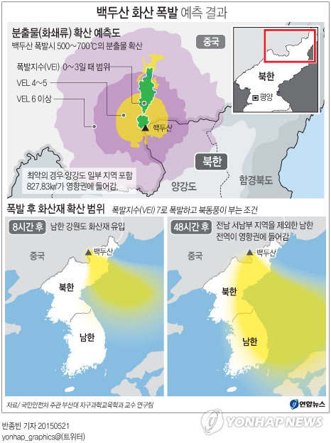 백두산이 폭발할 경우 가장 직접적인 피해를 입는 지역은 북한의 양강도와 중국의 지린성 일대이다. 그러나 화산재는 기류에 따라 남한 지역까지 내려올 수 있으며, 특히 수도권의 공항, 교통, 통신망에 큰 영향을 미칠 수 있다. 심한 경우 수돗물 오염, 정전, 대기 오염 등으로 이어지며 국민 건강에도 심각한 위협이 된다.