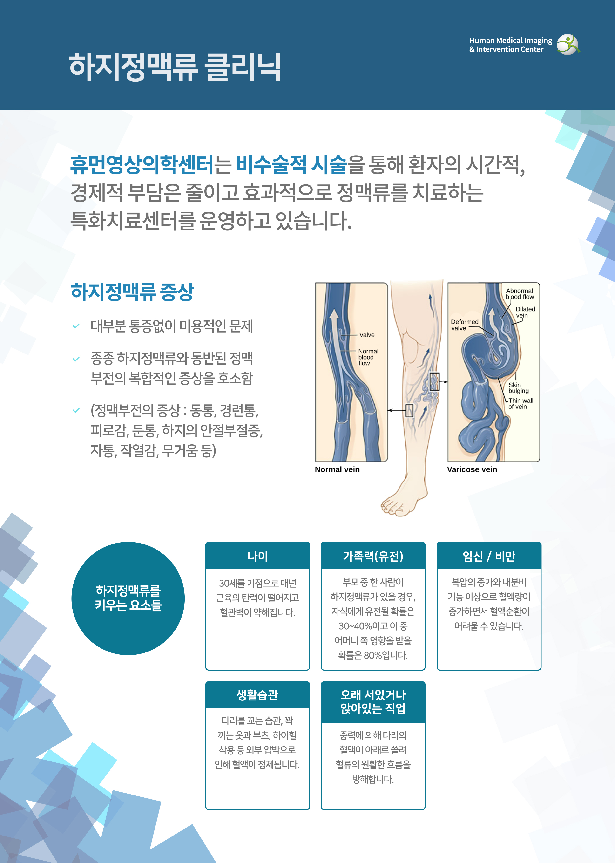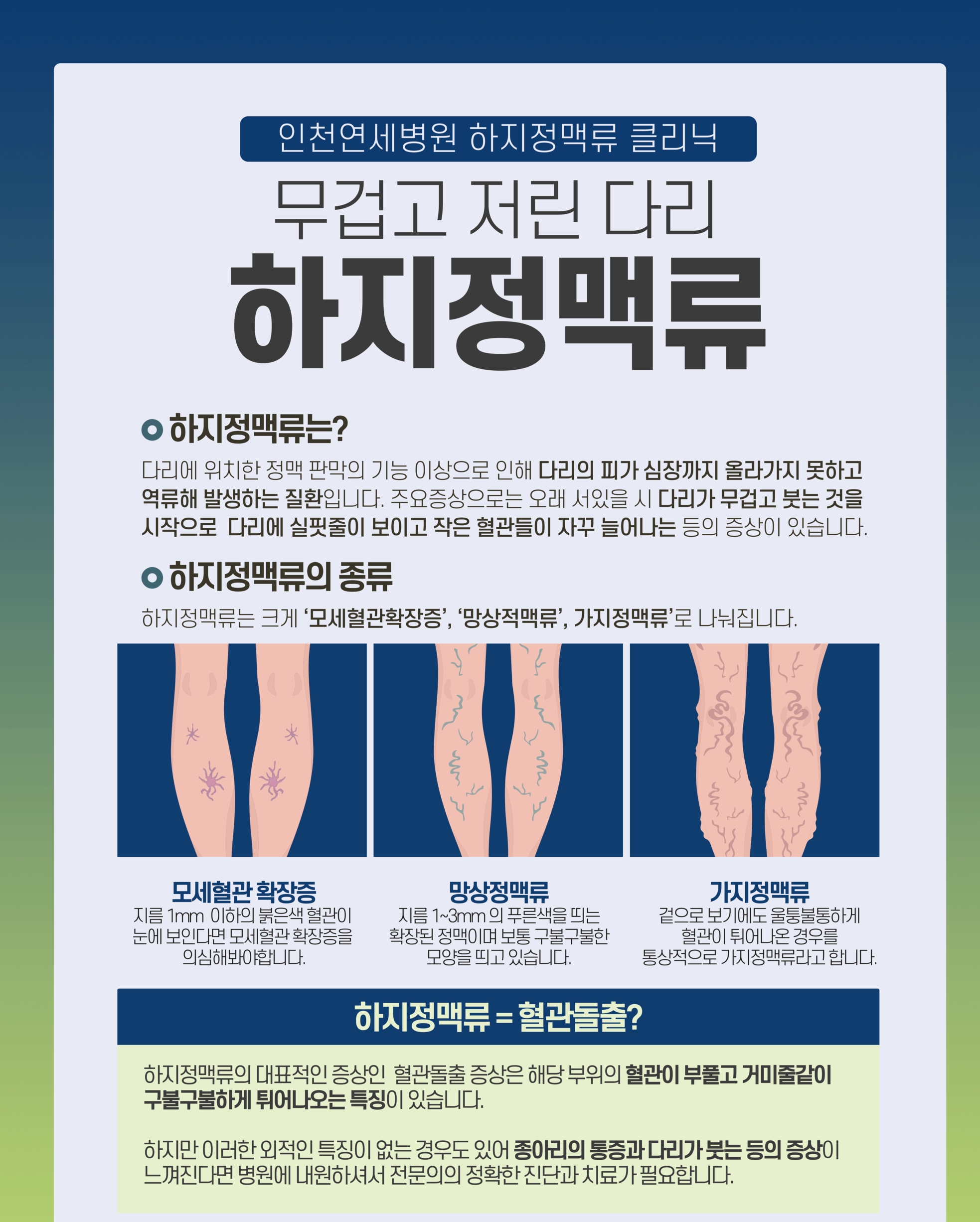 하지정맥류는 혈액이 심장으로 원활하게 돌아가지 못하고 다리 정맥에 고이면서 발생하는 질환이다. 다리 정맥의 판막이 제 기능을 하지 못하면서 혈액이 역류하고, 그 결과 정맥이 늘어나면서 피부 겉으로 비정상적으로 돌출되는 현상이 나타난다. 미용적인 문제뿐 아니라, 심하면 통증, 부종, 피부 색소 침착, 심부정맥혈전증 등 심각한 합병증으로 이어질 수 있다.