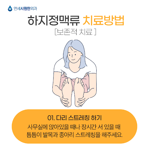 30분마다 자세 바꾸기: 오래 서 있거나 앉아 있지 말고, 정기적으로 다리를 움직인다.