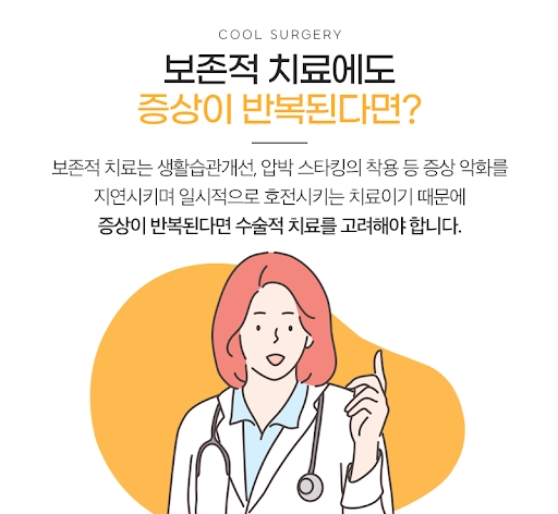 증상이 경미할 경우에는 생활습관 개선과 보조기구 사용으로도 충분히 개선될 수 있으며, 심한 경우에는 최소침습 시술이나 수술이 필요할 수 있다.