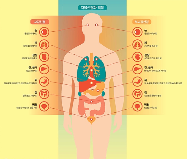 우리 몸에는 여러 신경 체계가 존재하지만, 그중에서도 자율신경계는 우리가 의식하지 않아도 자동으로 작동하는 생리 기능을 조절한다. 심장 박동, 호흡, 소화, 혈압, 체온 조절 등이 여기에 해당한다. 자율신경계는 크게 교감신경과 부교감신경으로 나뉜다.