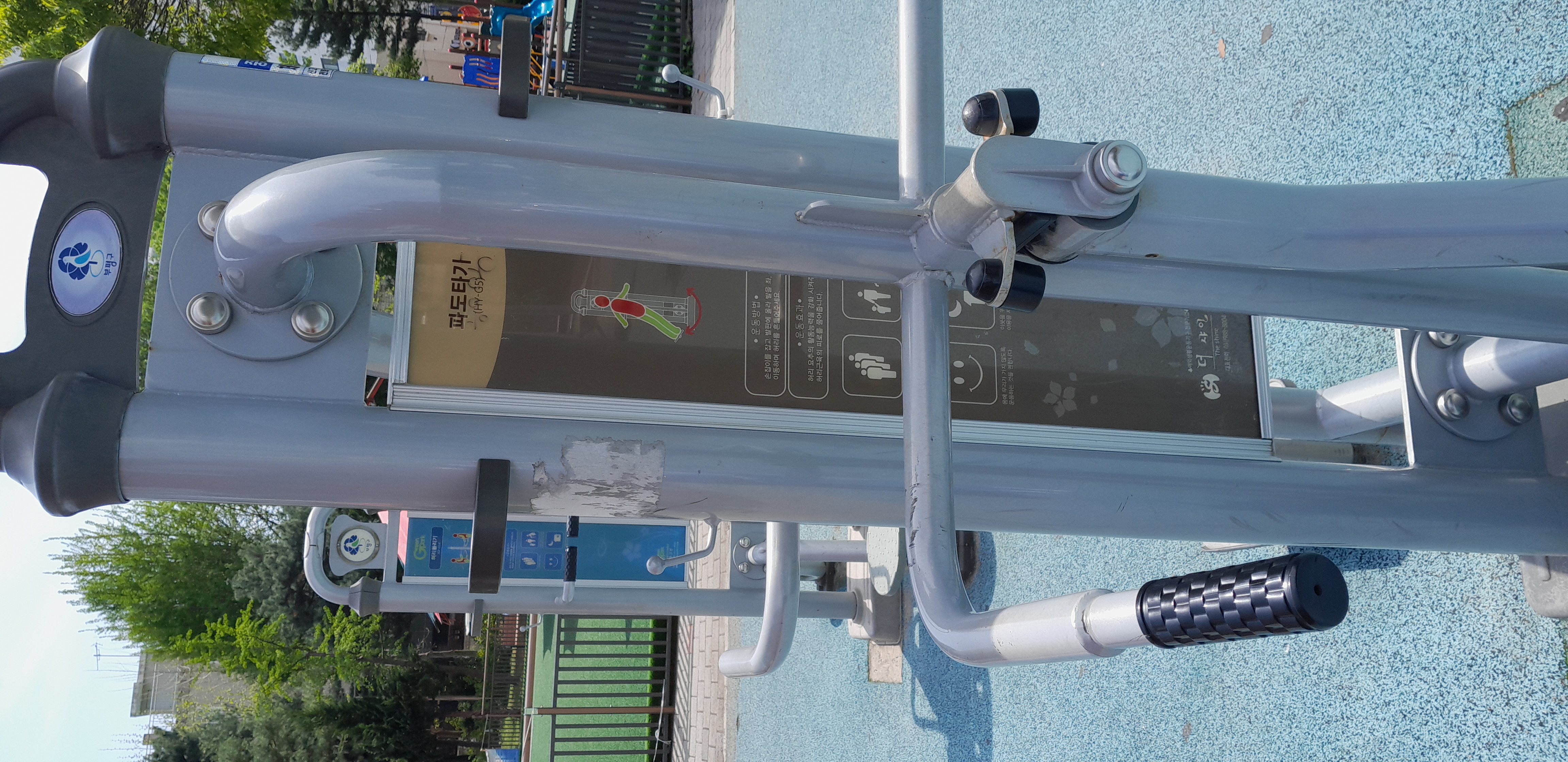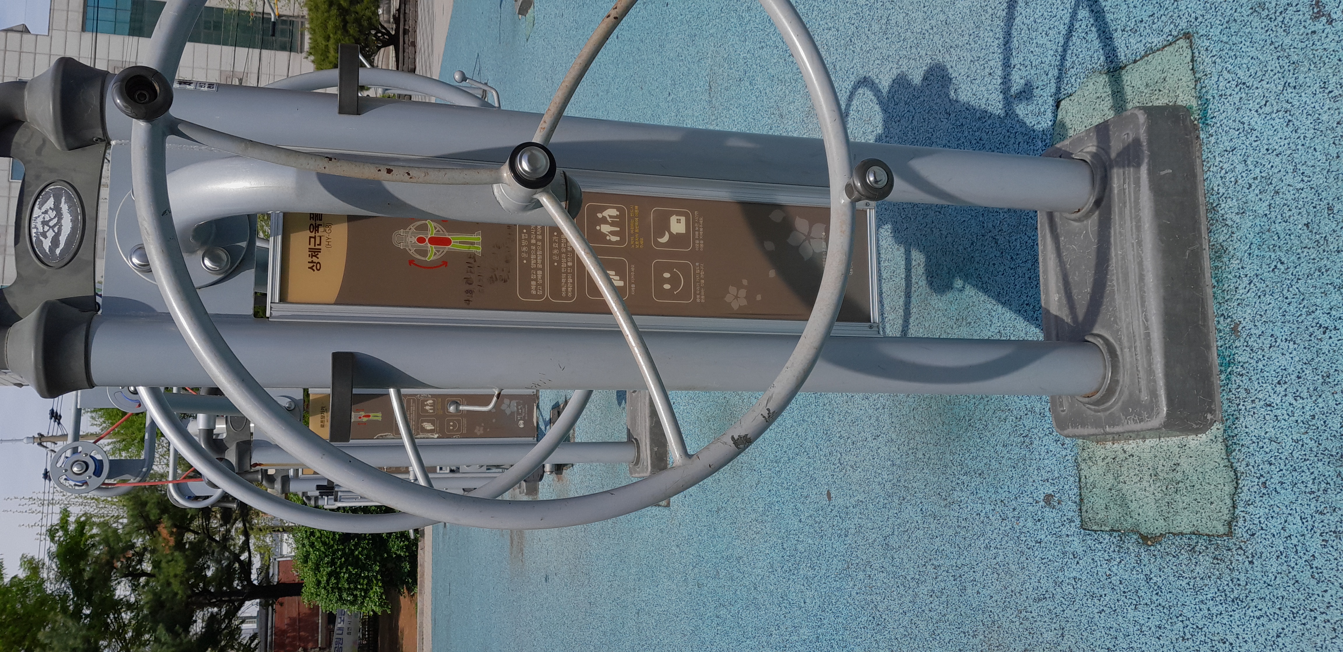 쓰임새: 이 기구는 공원이나 야외 운동 시설에 설치된 야외 운동기구로, 주로 허리와 복부 근육을 풀어주고 스트레칭하는 데 사용됩니다. 두 사람이 마주 보고 발판 위에 올라서서 양손으로 손잡이를 잡고, 허리를 좌우로 회전시키며 사용하는 방식입니다.