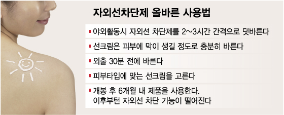 자외선차단제는 땀이나 유분, 물에 의해 쉽게 제거된다. 따라서 2~3시간마다 덧바르는 것이 이상적이다. 특히 야외활동 중에는 한 번 바르고 끝내지 말고, 일정 시간마다 반복 도포해야 한다.