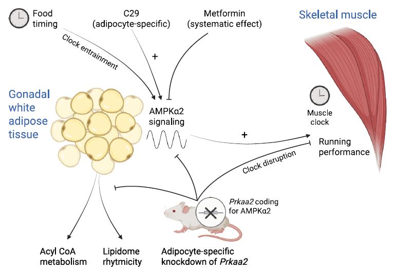 밤 시간에만 먹이를 제공하면 지방 조직의 AMPKα2 활성화로 인해 운동 능력 효과가 향상될 수 있다 ⒸCell Metab