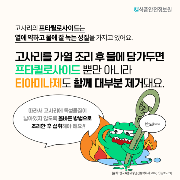 프타퀼로사이드의 수용성 특성: 이 독성물질은 수용성이므로 삶는 과정과 우려내는 과정에서 물로 배출된다.