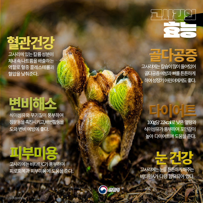 한국: 2025년 현재까지도 고사리는 인기 있는 식용 산나물이며, ‘삶고 말리는’ 전통 가공법을 통해 독성 물질을 제거한다는 전통적 지식이 활용되고 있다.