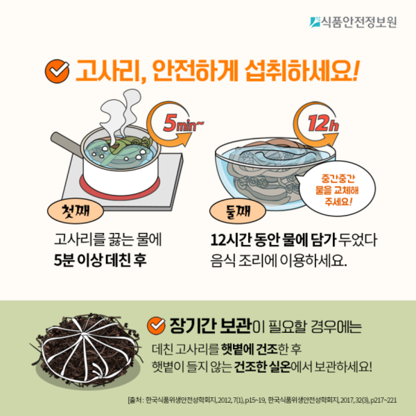 예를 들어, 서울대학교 식품영양학과에서 수행한 2017년 연구에 따르면, 고사리를 끓는 물에 15분간 삶고 12시간 우린 후 조리하면 프타퀼로사이드 함량이 95% 이상 감소하였다.