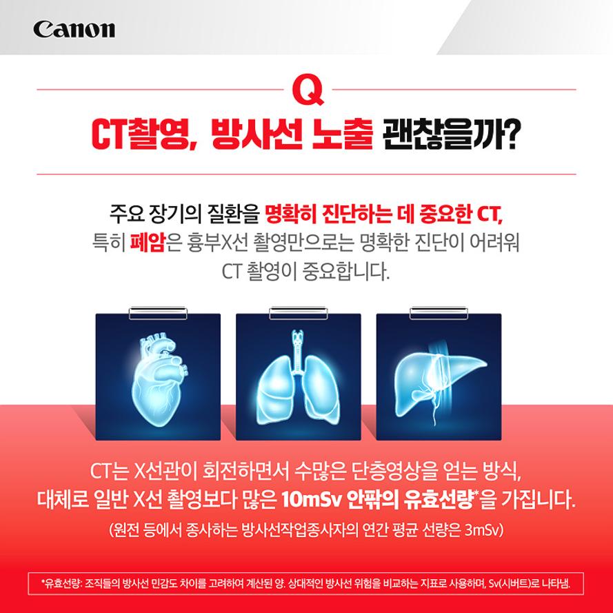 **CT(컴퓨터 단층촬영)**는 단일 촬영으로도 일반 엑스레이보다 수십10mSv에 이르는데, 이는 자연 방사선 노출량의 약 3년 치에 해당한다. 전신 CT나 복합 촬영(PET-CT)은 이보다 훨씬 높아질 수 있다. 국제방사선방호위원회(ICRP)는 일반인의 연간 피폭 한계를 1mSv로 제한하고 있는데, 검진용 영상촬영은 이 기준을 간단히 넘어버리는 셈이다.