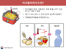 아크릴아마이드: 전분이 많은 식품을 120℃ 이상 가열할 때 생기는 물질로, **국제암연구소(IARC)**는 이를 2A급 발암물질로 분류함.