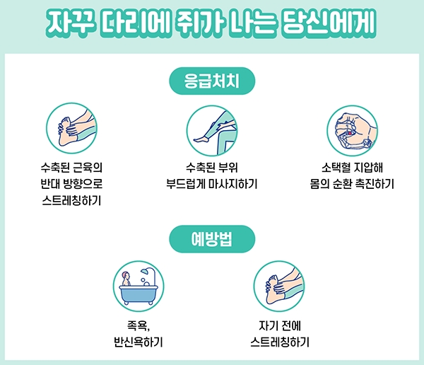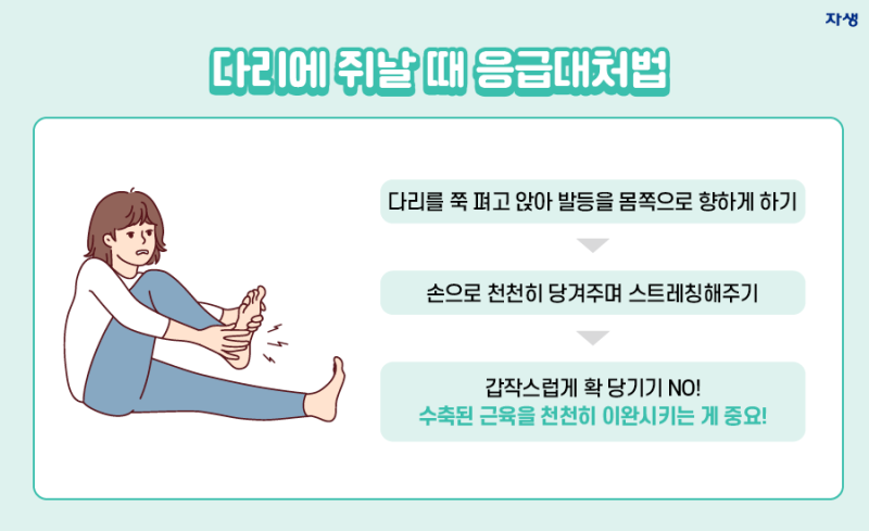 따라서 쥐가 났을 때는 다리를 펴고, 발끝을 몸 쪽으로 당기는 것이 가장 효과적인 대처법입니다.