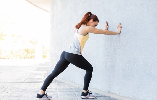 벽에 손을 대고 한 발은 뒤로 보내고 무릎을 편 상태에서 체중을 앞으로 밀기