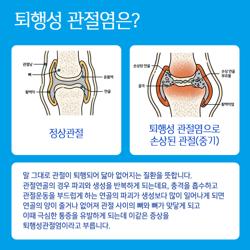 퇴행성 관절염: 관절 연골이 닳아 없어지면서 통증과 염증이 발생. 무릎, 손가락, 고관절 등에 흔합니다.