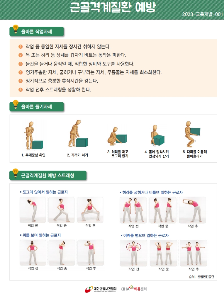 자세 교정: 오랜 시간 앉아 있는 직장인은 바른 자세를 유지해야 하며, 1시간마다 가벼운 스트레칭이 필요.