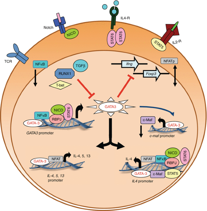 miR-4497은 Th2 세포 분화를 유도하는 핵심 전사인자인 GATA3 유전자의 mRNA를 직접적으로 타겟팅한다. GATA3는 Th0 세포가 Th2 세포로 분화되기 위해 필수적인 인자로, 이 유전자가 억제되면 Th2 반응이 차단된다. 뿐만 아니라, miR-4497은 IL-4 수용체의 신호 전달을 담당하는 STAT6 경로의 활성도 저해하는 것으로 나타났다. 이는 곧 IL-4에 의해 유도되는 Th2 반응을 이중으로 차단할 수 있음을 의미한다.
