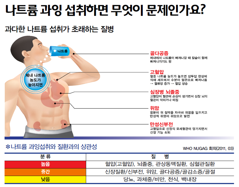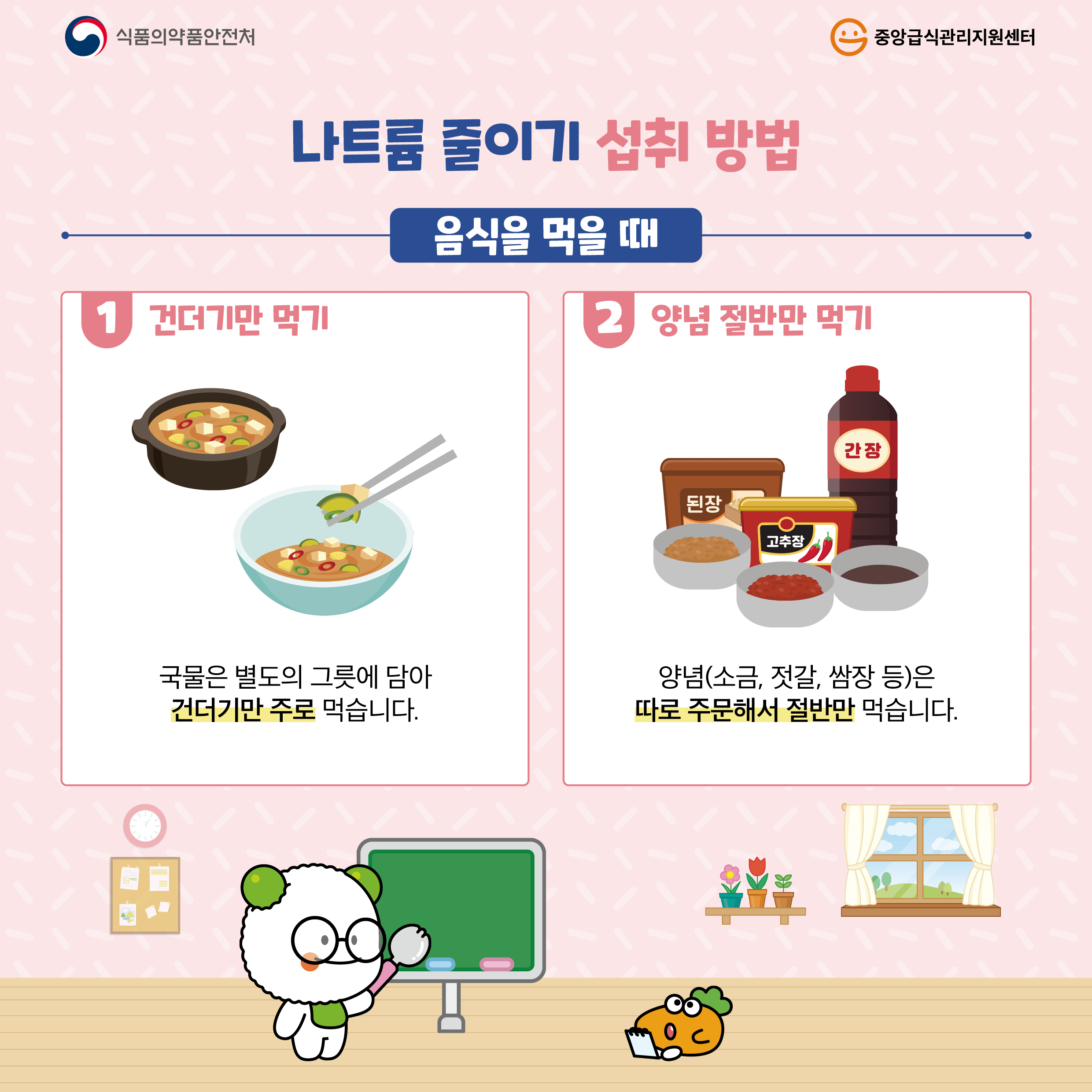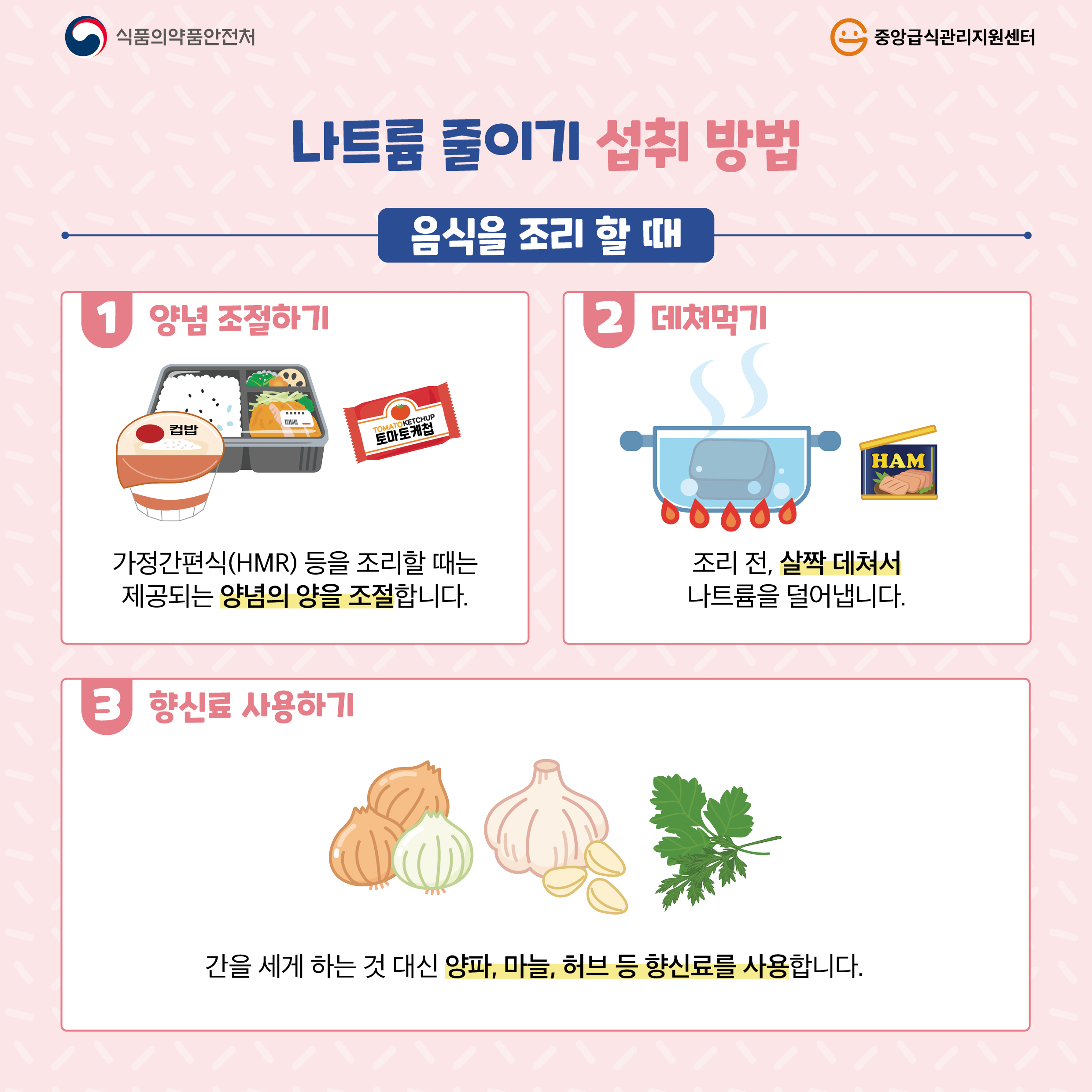 식품의약품안전처는 "나트륨 줄이기 운동"의 일환으로 음식점과 제조업체에 저염 레시피를 권장하고, 소비자들에게는 나트륨 함량이 표시된 식품을 선택할 것을 권고하고 있다. 최근에는 ‘저염 김치’, ‘무염 간장’, ‘저염 햄’ 등 다양한 저나트륨 제품이 출시되어 소비자의 선택 폭도 넓어지고 있다.