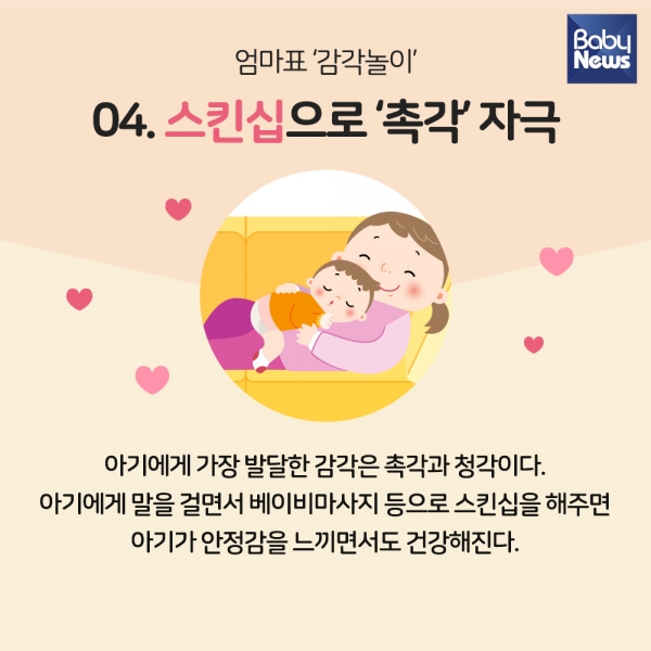 촉각: 피부는 신생아가 외부 세계를 인식하는 주요 수단이다. 특히 엄마와의 피부 접촉(스킨십)은 옥시토신 분비를 증가시켜 애착 형성과 스트레스 완화에 기여한다.