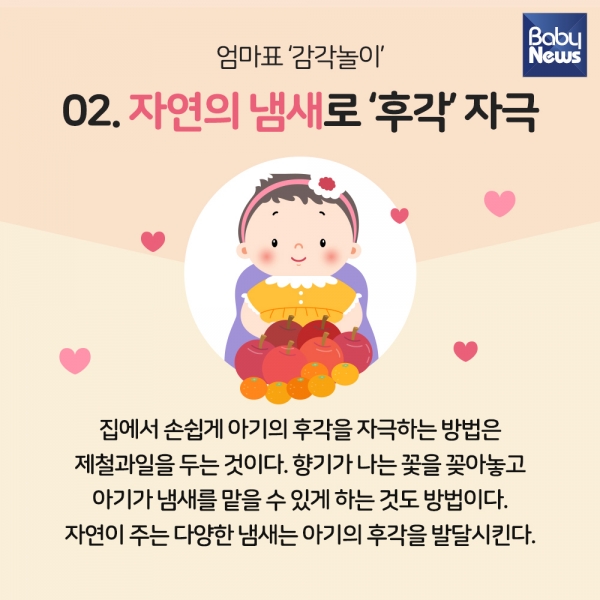 청각: 출생 직후부터 청각은 비교적 잘 발달되어 있으며, 엄마의 목소리를 구분할 수 있다. 자궁 내에서 듣던 엄마의 심장 박동과 음성은 아기에게 안정감을 준다. 1개월 무렵부터 소리의 방향을 감지할 수 있으며, 이는 언어 발달의 기초가 된다.