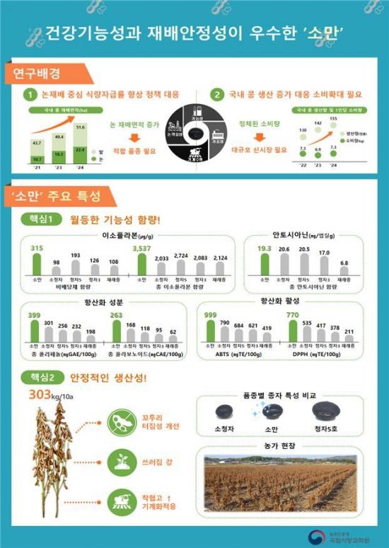 ‘소만’은 24절기 중 하나로, 이 시기에 수확되는 농작물은 영양이 풍부하다는 전통적 인식이 있다. ‘소만 검정콩’은 일반적인 대두(黃大豆)나 서리태, 쥐눈이콩과 비교해 껍질이 더 검고 작은 품종을 의미하는 경우가 많다. 지역에 따라 다르게 불리지만, 공통적으로 항산화 성분이 매우 풍부하다는 것이 특징이다. 일반적으로 검정콩은 껍질 부분에 안토시아닌, 이소플라본, 사포닌 등의 기능성 물질이 집중되어 있으며, 이들이 암세포 성장 억제에 영향을 미친다고 알려져 있다.