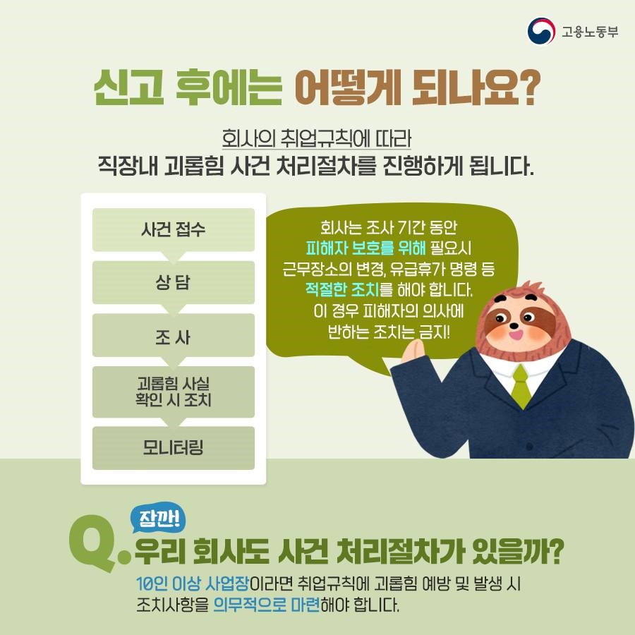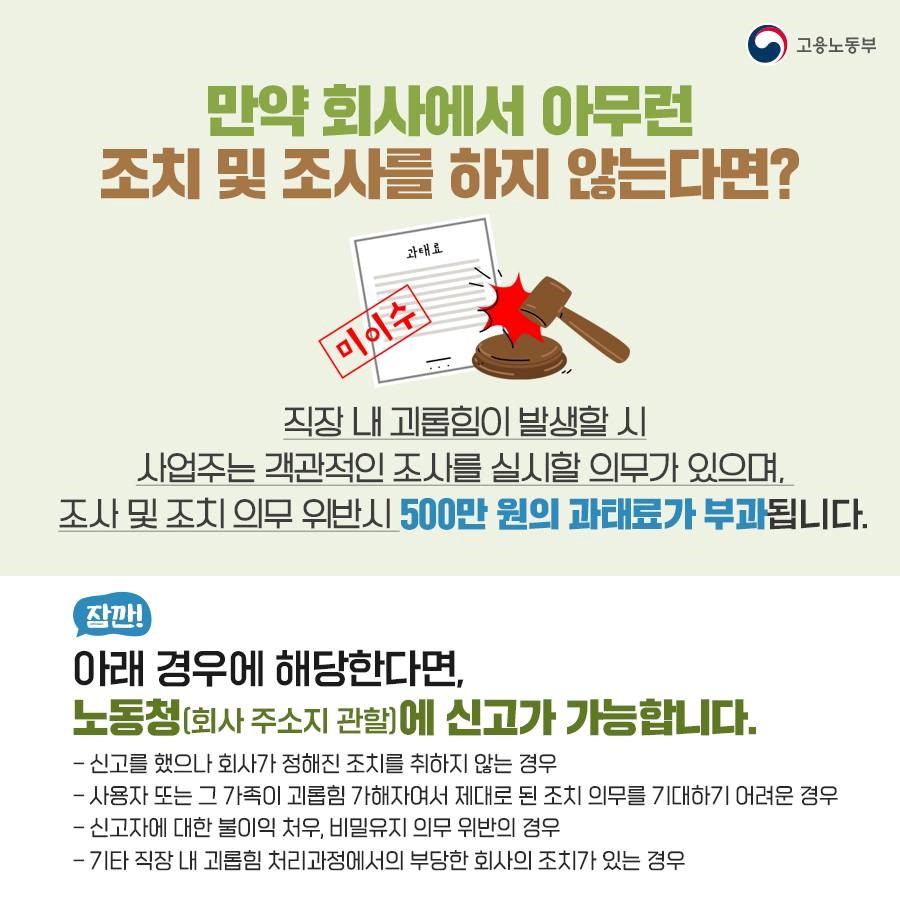 직장 내 괴롭힘을 방지하기 위한 법률을 강화하고, 신고 시스템을 활성화해야 한다.
